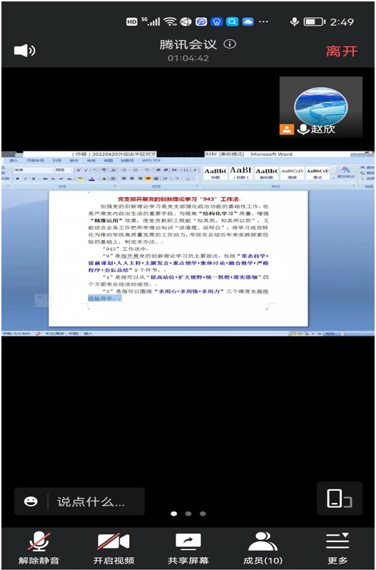 2022年4月20日,外國語學(xué)院分黨委組織開展黨的創(chuàng)新理論學(xué)習(xí)“943”工作法專題培訓(xùn),會議采取線上形式,分黨委書記趙欣主持,各黨支部書記參加。