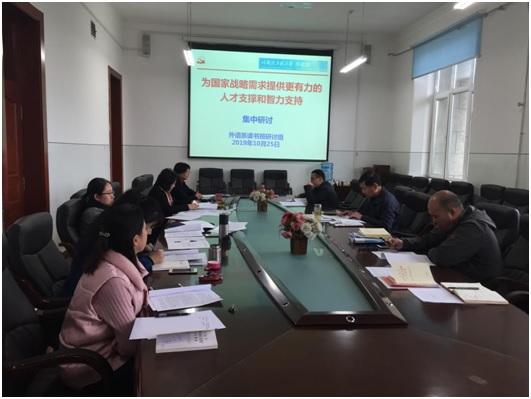 按照學(xué)校“不忘初心、牢記使命”主題教育集中學(xué)習(xí)計劃安排,外語系于10月25日12:00在41#417,組織班子成員圍繞為國家戰(zhàn)略需求提供更有力的人才支撐和智力支持開展集中研討。集中研討由分黨委書記趙欣主持,班子成員全體參加,系黨委委員楊劍、范瑩芳、李麗、由春橋列席研討。