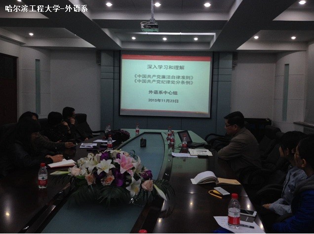 11月23日下午,外語系領(lǐng)導(dǎo)班子、系直黨支部全體黨員召開了中心組專題學(xué)習(xí)擴(kuò)大會(huì)議,學(xué)習(xí)十八屆五中全會(huì)精神、《中國共產(chǎn)黨廉潔自律準(zhǔn)則》和《中國共產(chǎn)黨紀(jì)律處分條例》,學(xué)習(xí)會(huì)議由系黨委書記趙欣主持。