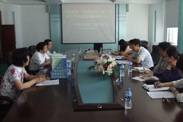 6月1日上午,校黨委副書記高晚欣、宣傳部部長王永友等一行3人蒞臨外語系,檢查指導(dǎo)“黨建創(chuàng)優(yōu)工程”迎評(píng)準(zhǔn)備工作。外語系黨委書記、支部書記代表參加了會(huì)議。
