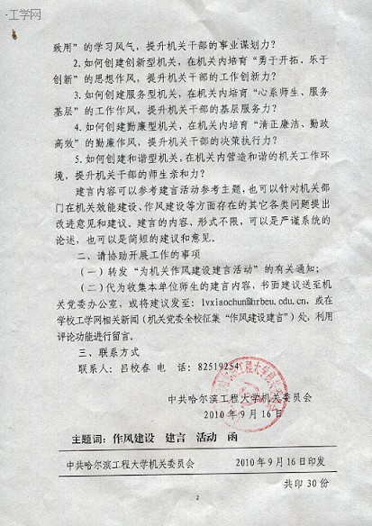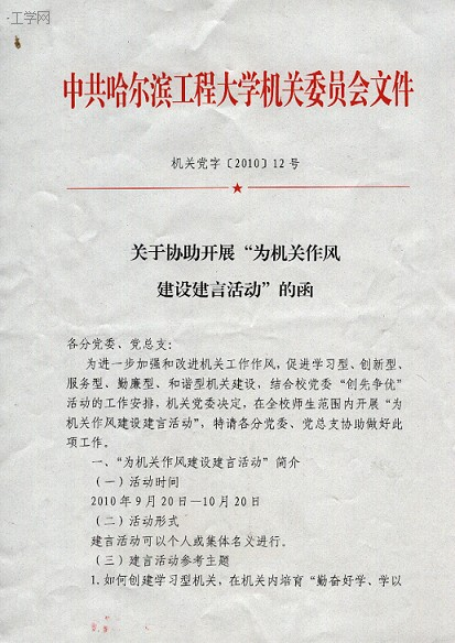 請(qǐng)按照機(jī)關(guān)黨委【2010】12號(hào)文件的精神,以基層部門為單位積極為校機(jī)關(guān)作風(fēng)建設(shè)建言獻(xiàn)策,并上報(bào)綜合辦公室,電子版發(fā)送至fld@hrbeu.edu.cn郵箱。