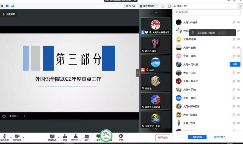 為了更好地貫徹實施學(xué)校“十四五”規(guī)劃、“雙一流”建設(shè)三年行動計劃和學(xué)院重點工作,2022年4月27日下午,外國語學(xué)院組織召開了2022年重點工作落實部署工作會議。院長朱殿勇主持會議,學(xué)院領(lǐng)導(dǎo)、全院教師及相關(guān)管理人員參加會議。