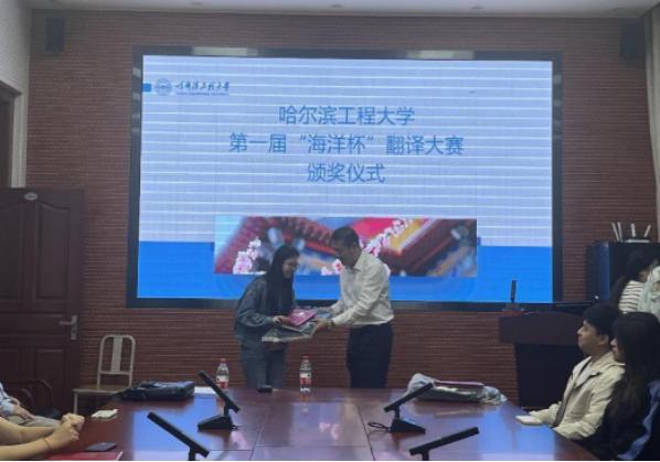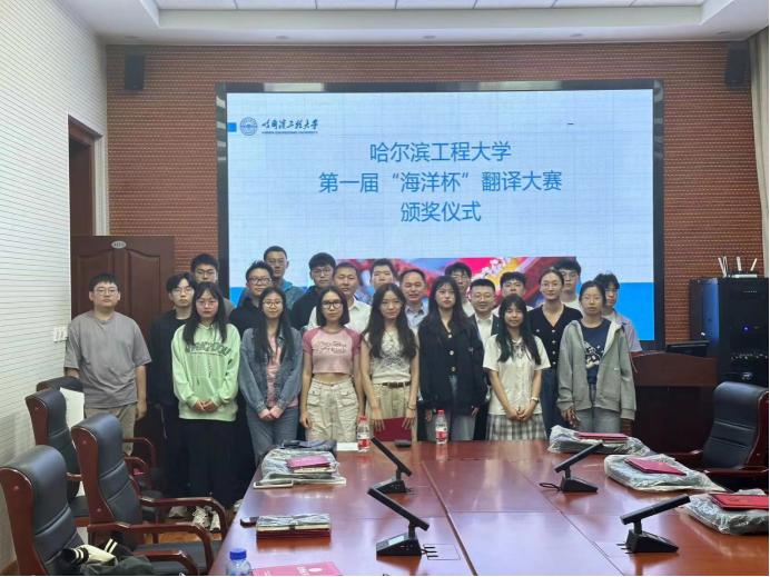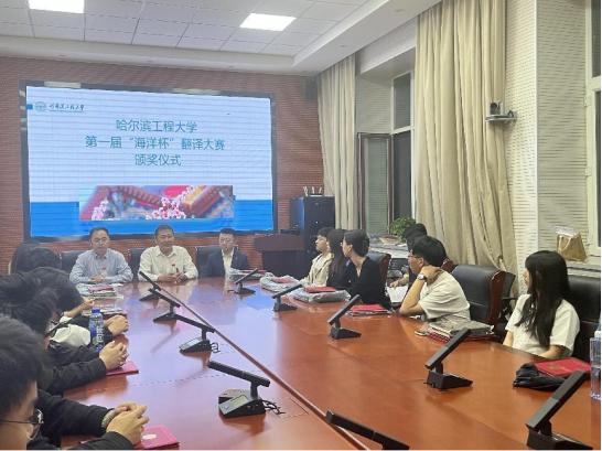 9月6日晚,外國語學院于41號樓417教室舉辦哈爾濱工程大學第一屆“海洋杯”翻譯大賽頒獎儀式,外國語學院院長朱殿勇、外國語學院教師王慶忠和朱戈勛擔任頒獎嘉賓,全體獲獎同學參與。