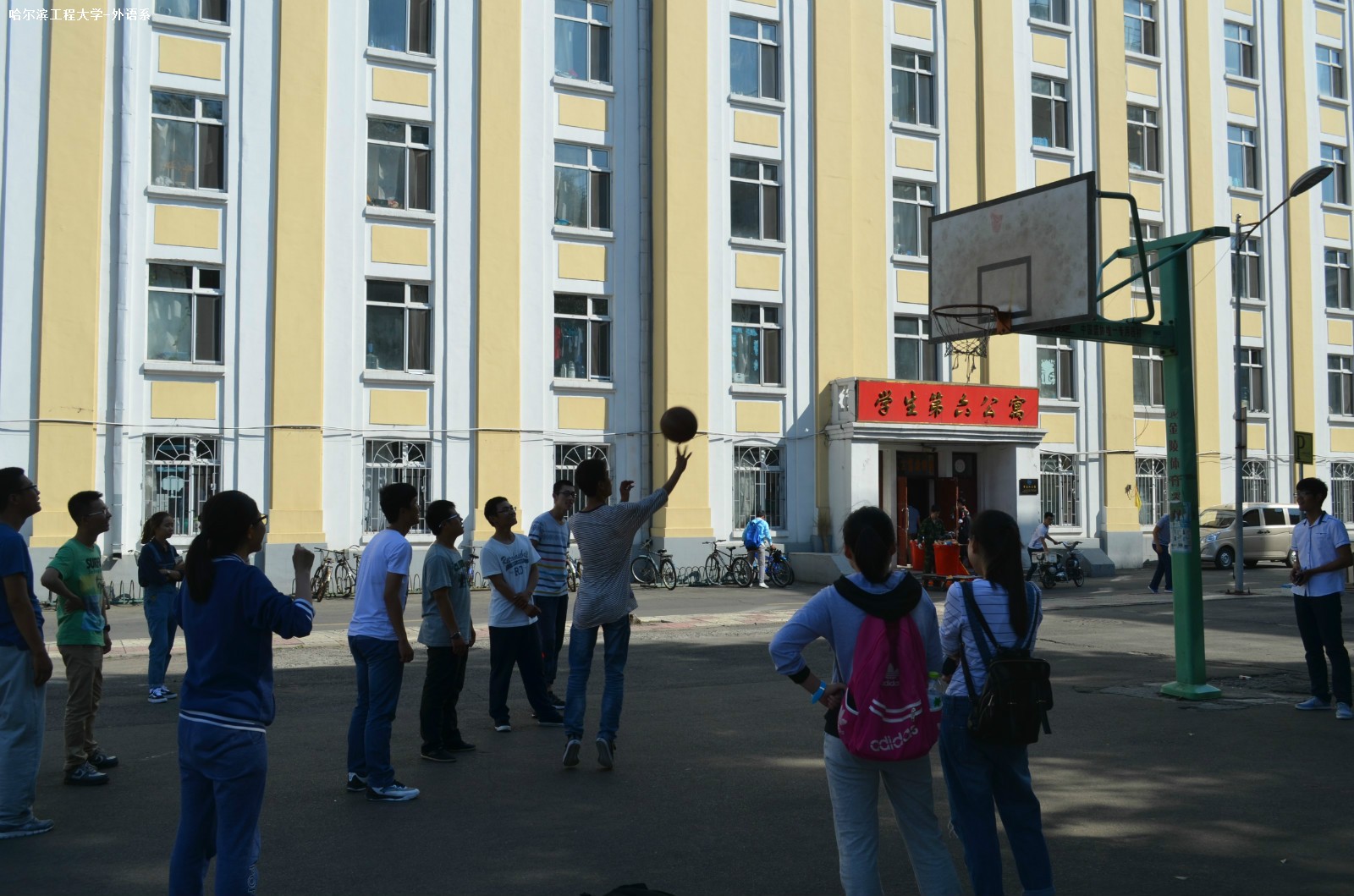 9月16日中午12點50分,由外語系學生會體育部舉辦的“旋轉后定點投籃”比賽在六公寓前籃球場舉行。外語系大一大二全體參加了此次活動。