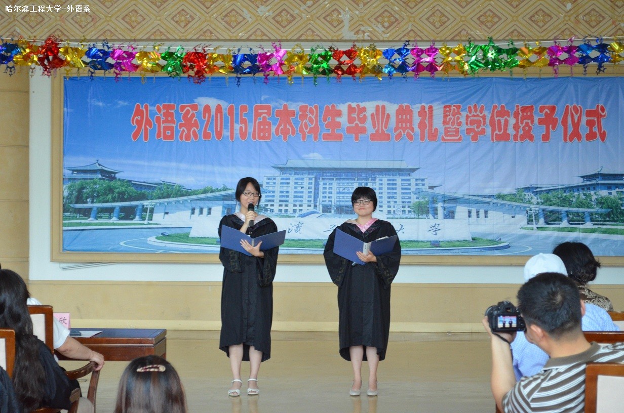 首先由外語系副主任鄭玉榮教授宣讀“本科生學士學位授予文件”和“本科生雙學位授予文件”,外語系副主任王慶忠副教授宣讀“優(yōu)秀畢業(yè)生表彰文件”。