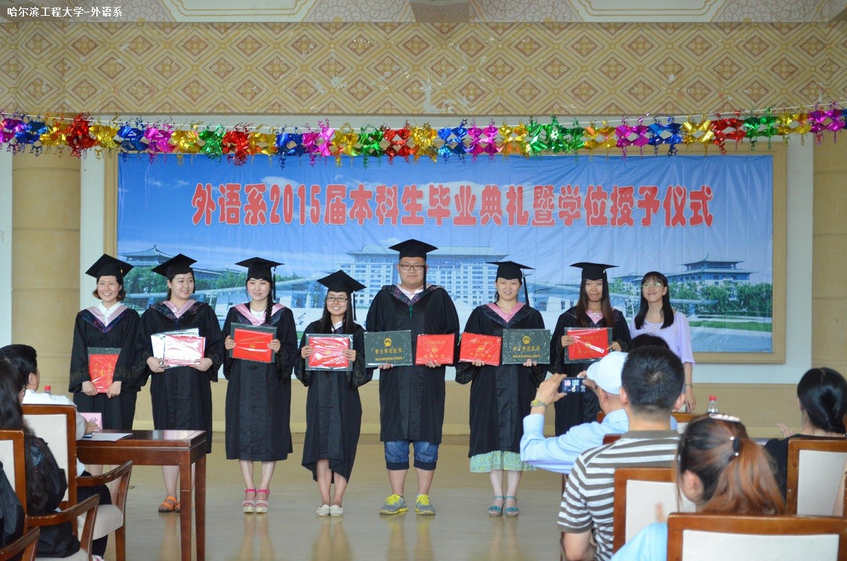 26日下午三點整,外語系在啟航活動中心教師沙龍舉辦了2015屆本科生舉辦了2015屆畢業(yè)典禮暨學位授予儀式,副校長高晚欣教授,外語系黨委書記陳巖教授,外語系副主任王慶忠副教授,外語系副主任鄭玉榮教授,外語系黨委副書記于磊老師,外語系的部分教師,部分畢業(yè)生家長以及全體畢業(yè)生出席本次畢業(yè)典禮。此次畢業(yè)典禮以“回憶?感恩?奉獻”為主題,有扣人心弦的音樂,意氣風發(fā)的誓言和感動至深的淚水相互交織,師生間的親切關懷以及畢業(yè)生與母校難以割舍的情誼。
