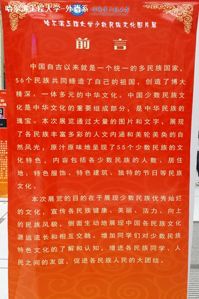 5月9日上午9時,哈爾濱工程大學(xué)在啟航大廳舉辦為期兩周的第三屆少數(shù)民族文化節(jié),此次活動由哈爾濱工程大學(xué)學(xué)生工作處主辦,各院系承辦。外語系在此次活動中積極承辦了少數(shù)民族文化圖片展。