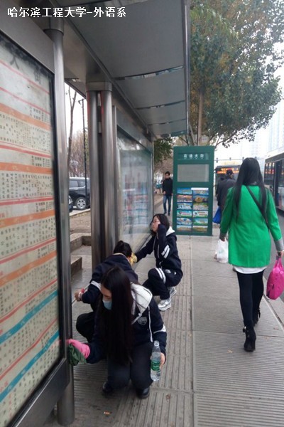 到達公交站牌后志愿者們紛紛拿起了抹布,將站臺的站牌玻璃擦干凈,每個人都手持不同的工具,開始了本次的清掃活動。有的人用小刀將緊貼在站牌上的小廣告去除;有的人用掃帚將站臺的垃圾掃到垃圾桶旁邊方便環(huán)衛(wèi)工人清掃;有的人一手報紙一手抹布,將站牌玻璃擦得干干凈凈;有的人穿行在人群中間提醒大家注意腳下衛(wèi)生……大家都忙的不亦樂乎。