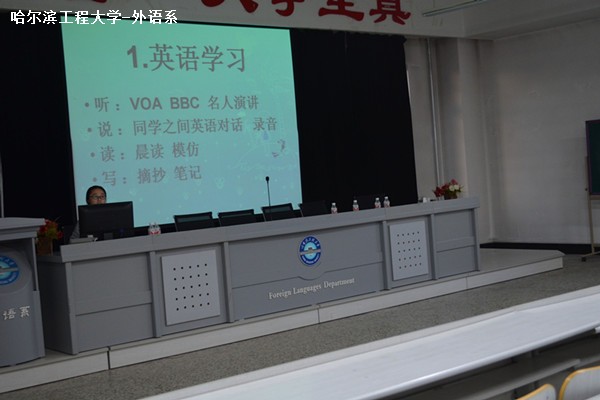 首先主持人向新生們介紹主講人吳丹的情況,吳丹同學(xué)因成績(jī)優(yōu)異以及工作出色受邀參加本次講座。介紹完畢,全場(chǎng)新生用熱烈的掌聲歡迎她的到來(lái)。然后,吳丹同學(xué)先向在場(chǎng)大一新生講授了學(xué)習(xí)英語(yǔ)的方法:持之以恒,多多積累,積極探討,不懂就問(wèn)。這樣的學(xué)習(xí)態(tài)度是她取得優(yōu)異成績(jī)的關(guān)鍵。隨后,吳丹同學(xué)具體地向大一新生介紹了預(yù)習(xí)及復(fù)習(xí)策略,主要圍繞三方面:如何記單詞,如何練口語(yǔ),如何充分利用影視資源。主講人講解詳細(xì),清晰,不時(shí)贏得了全場(chǎng)大一新生們的熱烈掌聲。大一同學(xué)們都聽(tīng)得很認(rèn)真,每一個(gè)人對(duì)此次講座都非常重視,還在現(xiàn)場(chǎng)提了幾個(gè)關(guān)于英語(yǔ)學(xué)習(xí)方法的問(wèn)題,可見(jiàn)大家對(duì)學(xué)習(xí)方面的重視,現(xiàn)場(chǎng)氣氛十分活躍。
