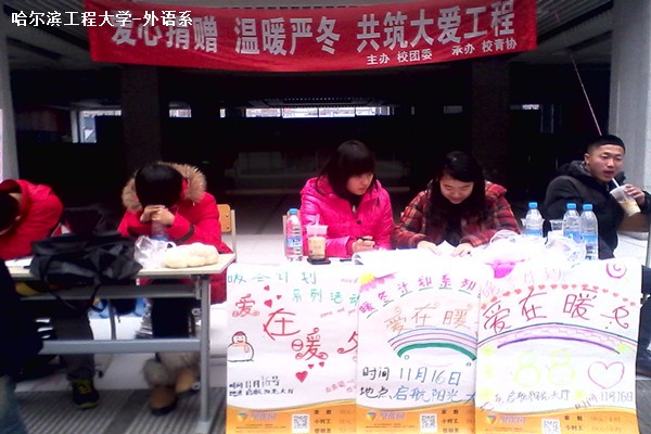 11月17日上午8時(shí)30分至下午3時(shí),校青協(xié)舉辦的“暖冬計(jì)劃”在啟航陽(yáng)光大廳順利進(jìn)行。由各個(gè)院系的實(shí)踐部和系青協(xié)帶領(lǐng)同學(xué)們進(jìn)行募捐物品的捐贈(zèng)。外語(yǔ)系的青協(xié)成員及校青協(xié)的工作人員,精神抖擻地進(jìn)行著自己的工作,工作秩序井然。這次活動(dòng)旨在為學(xué)校的貧困學(xué)生提供過(guò)冬的行裝,同時(shí)也在呼吁廣大同學(xué)奉獻(xiàn)自己的愛(ài)心。
