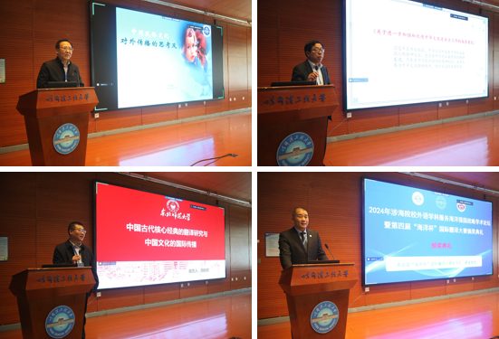 大連外國語大學原副校長楊俊峰、上海大學國學雙語研究院院長趙彥春、東北師范大學外國語學院院長周桂君作了翻譯專題報告,第四屆“海洋杯”國際翻譯大賽秘書長曹斌進行頒獎致辭。