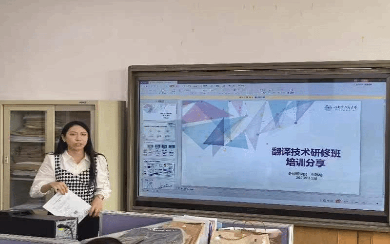 然后,付琳納老師分享“翻譯技術(shù)研修班”培訓(xùn)的主要內(nèi)容,介紹AI時代翻譯技術(shù)與語言服務(wù)行業(yè)的發(fā)展趨勢,詳細(xì)闡釋GPT時代翻譯技術(shù)發(fā)展趨勢、語言服務(wù)行業(yè)發(fā)展概況以及翻譯人才技術(shù)能力培養(yǎng)的問題。隨著生成式人工智能(GPT)的出現(xiàn),深度學(xué)習(xí)算法不斷迭代,機器翻譯也應(yīng)運而生,翻譯技術(shù)對高校師生來說既是機遇又是挑戰(zhàn)。同時,由于需求轉(zhuǎn)變,語言服務(wù)已成為國家發(fā)展熱點,國內(nèi)也經(jīng)歷了從翻譯服務(wù)到語言服務(wù)的變革。目前,翻譯技術(shù)應(yīng)用能力已成為譯者的核心能力,在實際的翻譯專業(yè)教學(xué)中,教師也應(yīng)注重培養(yǎng)學(xué)生的信息素養(yǎng)和專業(yè)綜合能力。