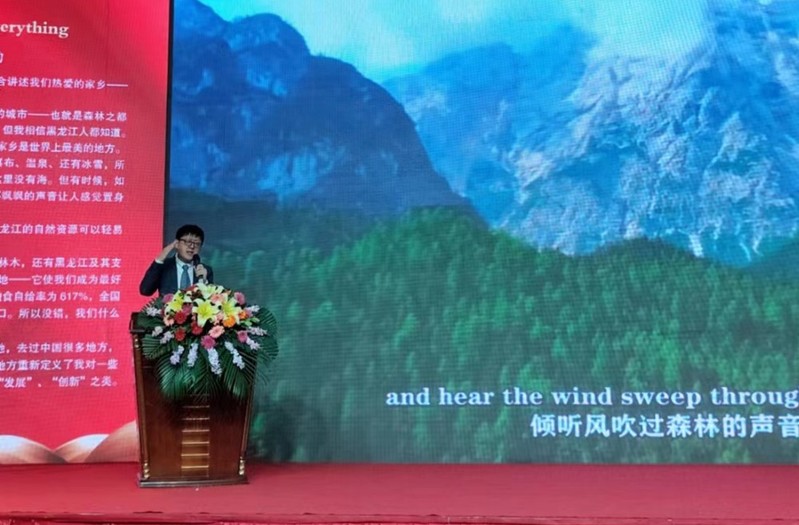 與頒獎典禮交替進行的是現(xiàn)場展演活動。16名獲獎代表用9種不同語言進行了現(xiàn)場演講,從不同視角展示自己眼中的黑龍江。作為獲獎代表之一,我校張俊南老師以《We Have Everything》為題進行了英文展演,結(jié)合自身成長的階段講述了對龍江由淺及深的認識,以及對二十大之后龍江未來的無限期待,詞真意切、聲情并茂,精彩的演講獲得全場觀眾熱烈的掌聲。