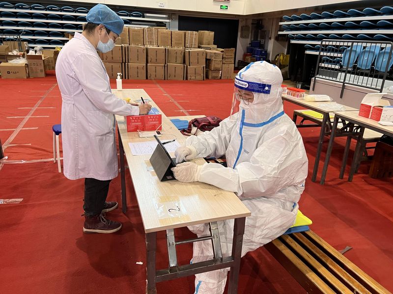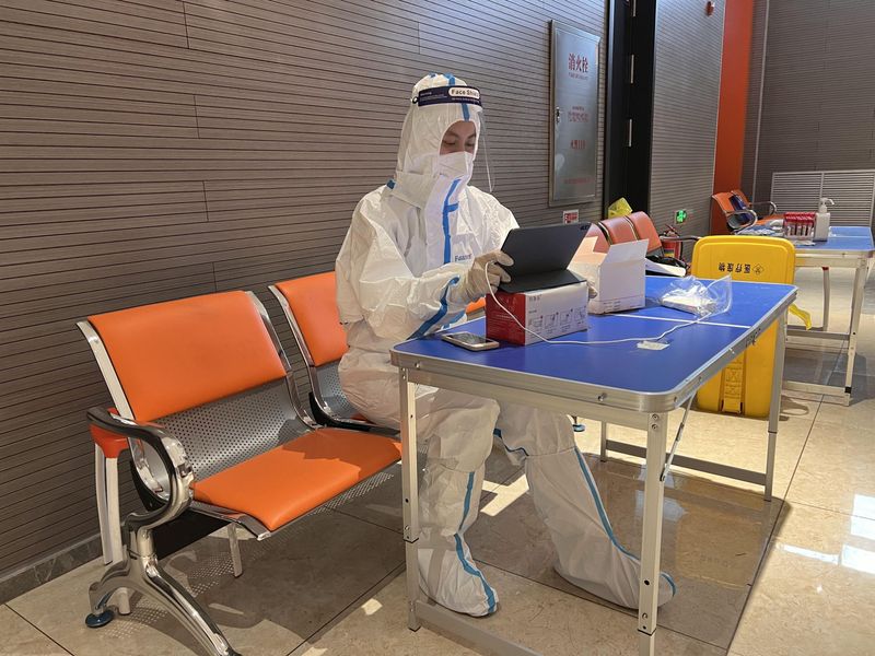 本次志愿服務(wù)工作為協(xié)助醫(yī)護人員掃碼、分組。三位教師按要求到達指定地點后,接受了軟件使用及檢測流程培訓;在穿戴好防護服之后便立刻投入到工作之中。當日為校內(nèi)師生抽檢,但參檢人數(shù)依然眾多,每組需完成1200人的核酸檢測。從12:30至17:00,志愿服務(wù)工作緊張有序地持續(xù)進行,在此期間不得脫下防護服,也不能離開崗位休息或喝水進食,三位教師克服困難,順利完成了今日的志愿服務(wù)檢測工作。
